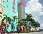 None of the new buildings exceeds 12 or 13 storeys and most showed a crisply streamlined horizontal line intersected in the centre by a series of strong vertical lines, culminating in a finned tower or cuppola. White stucco alternated with a marvellous range of subtropical pastel facades or trim - pink, green, peach & lavender. The windows were etched with flamingoes, herons, seashells, palms & sunbursts. Neon lighting & flagstaffs completed the effect.